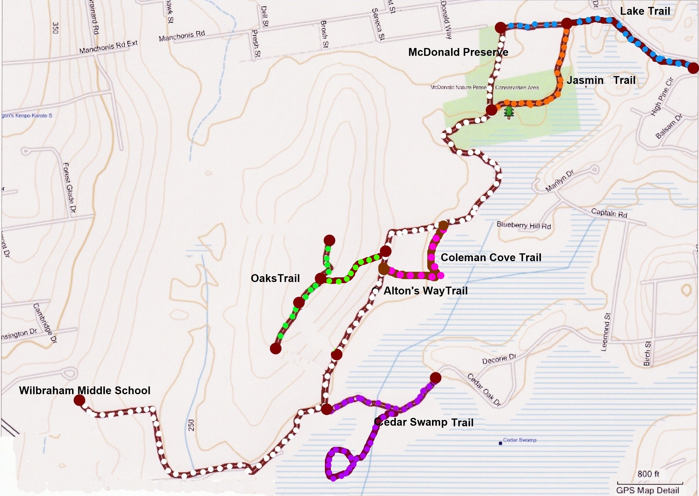 - Trails: This list starts from Wilbraham Middle School. Overall, most of the footing is easy to traverse, but there is a small stream to cross and some matted grass areas. The elevation is mostly flat with a few small, rolling hills. As there are many trails along the way that meander off to the right into the Cedar Swamp area, it is important to follow the directions below as closely as possible. Use of a GPS to track the way points below is advisable.