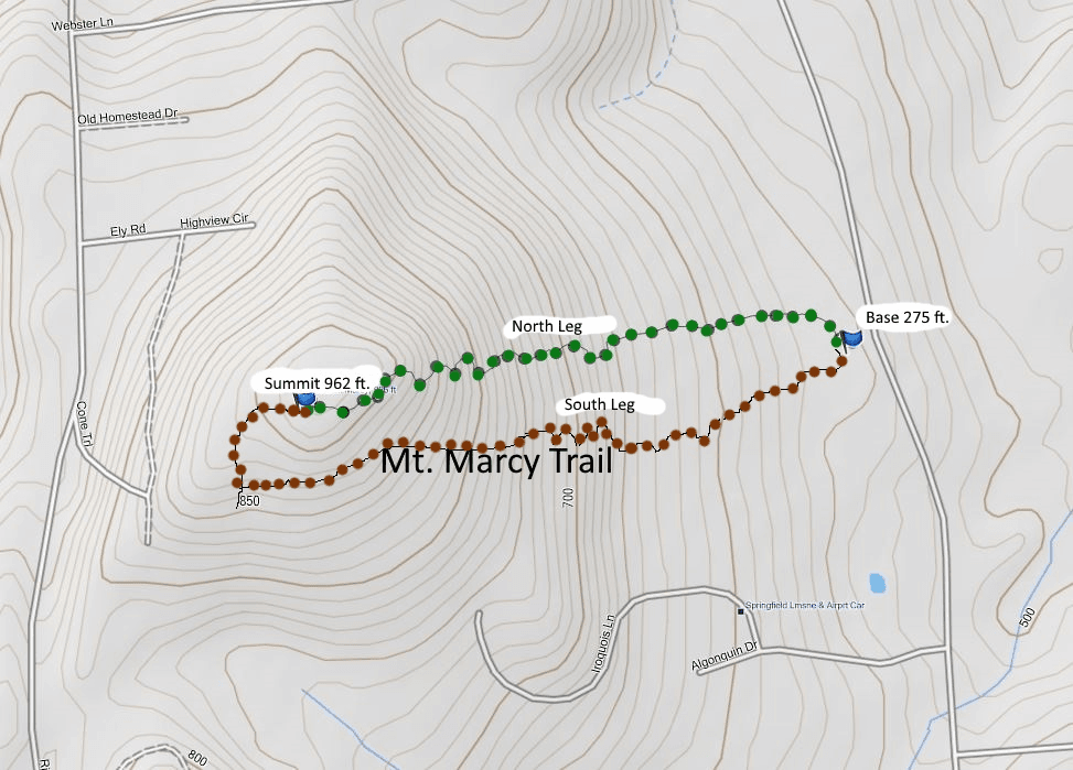 - Directions: From Wilbraham center on Main Street travel south towards Hampden. Take a left onto Monson Road. Go up the mountain and down the other side. Take a left onto Glendale Road at the cemetery. Travel down Glendale for a mile until you see Algonquin Drive (on left). After passing a few houses, keep your eyes peeled for an abrupt left turn (break in the wood line) which is the entrance to the Mount Marcy parking lot. Look for the Mt. Marcy sign. If you see a red house that has a “Little Brook” sign on it (on right) you went too far.