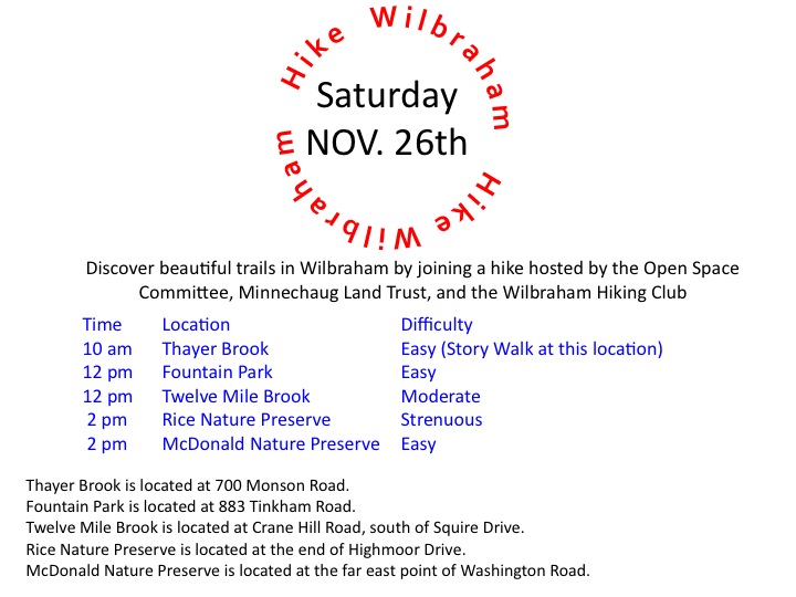 On the Saturday after Thanksgiving, November 26th, the Wilbraham Open Space Committee, along with the Minnechaug Land Trust, and the Wilbraham Hiking Club are hosting a series of hikes throughout Wilbraham. This is an event to help folks become aware of the wonderful natural spaces that Wilbraham has. Please refer to the schedule below for times. Hope to see you out there!